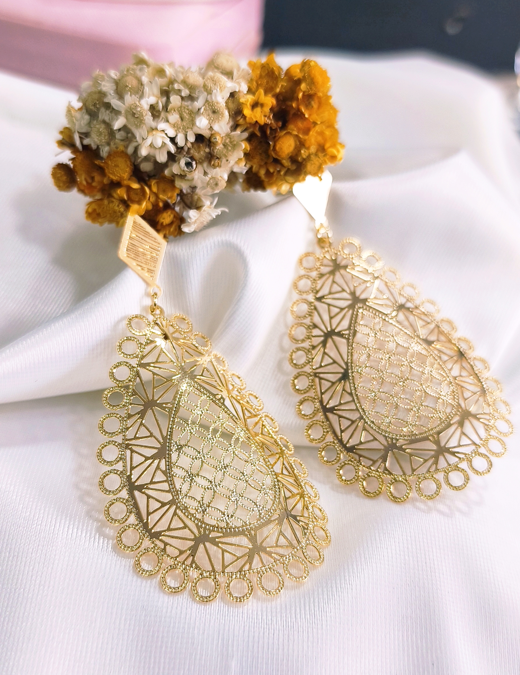 BV 4258 Maxi Brinco Rendado Diamantado Gota (6x4cm) Yellow Semijóias c/ Banho de Ouro 18k.