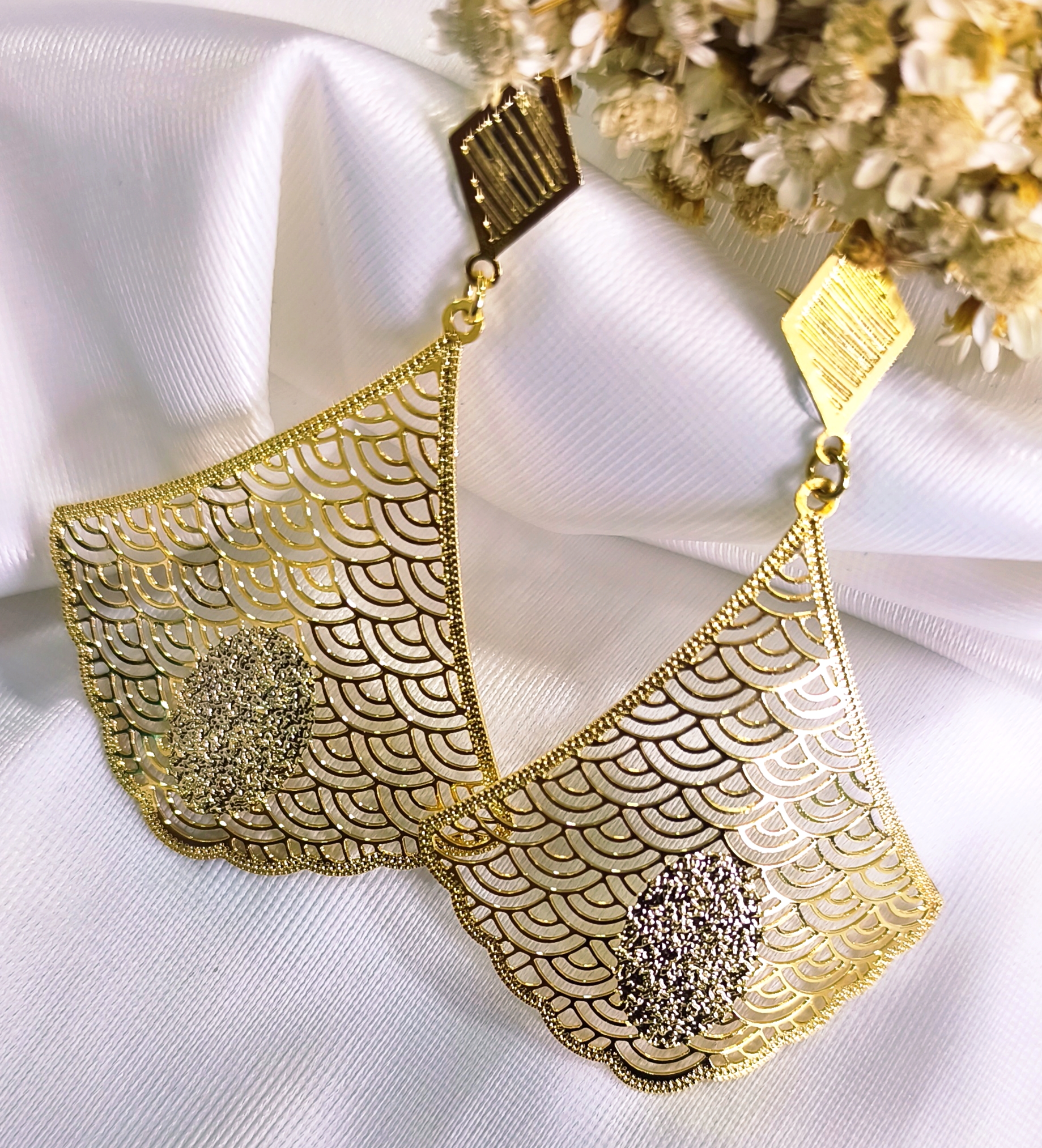 BV 4260 Maxi Brinco Triangulo Rendado Diamantado Yellow Semijóias c/ Banho de Ouro 18k.